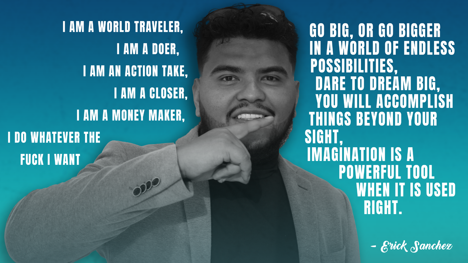 Erick went back to his restaurant job but moved on as soon as he qualified for his green card. This is when he got his first commission-based job doing business to business, marketing a makeup company. He didn’t really care for this particular business, but he quickly fell in love with the business model. This business showed him about leadership, closing sales, business tactics and more. Although he learned a lot in the time being, he was let go after 6 months which brought him back to square one.